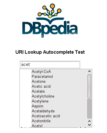 On the DBPedia discussion mailing list there was a post on a nice web page which allows you to look up things, and which features a autocomplete edit field. The below screenshot show lookup of molecular structures: