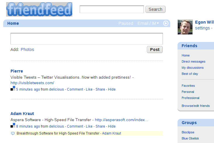 FriendFeed is the missing link between social [bookmarking|news|…] and IRC (#cdk on irc.freenode.net); I quite like it. Anyway, as of today, they have a new layout, and that I do not like. No more icons for feed types, and big avatar photo’s. Really, I know what my fellow blogger look like (even met many of them in London last year). The rest of the layout is a bit too colourful for my taste.