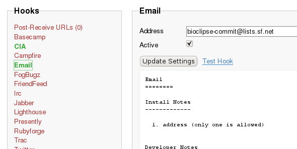 GitHub turns out to be our big friend here, not SourceForge, which only supports one Git repository. GitHub recently must have added hooks recently, but I am really happy to see those. The above Bioclipse repositories have hooks turned on for CIA (so that commit messages end up on our #bioclipse IRC channel) and email (as indicated by the green color):
