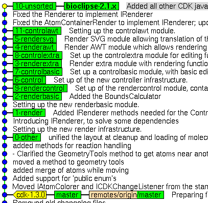 Not so long ago, I finished porting the JChemPaint-Primary branch to be a patch on top of CDK master from our git repository. This means frequent rebasing, to incorporate the latest changes in the CDK master branch. Today, I did such a rebase, after the CDK 1.3.0 release. Hoping that at least some find this informative, this is what I did. Remember, that the patch is organized around the render and control modules, which is why we have so many branches, while merely in linear relationship.
