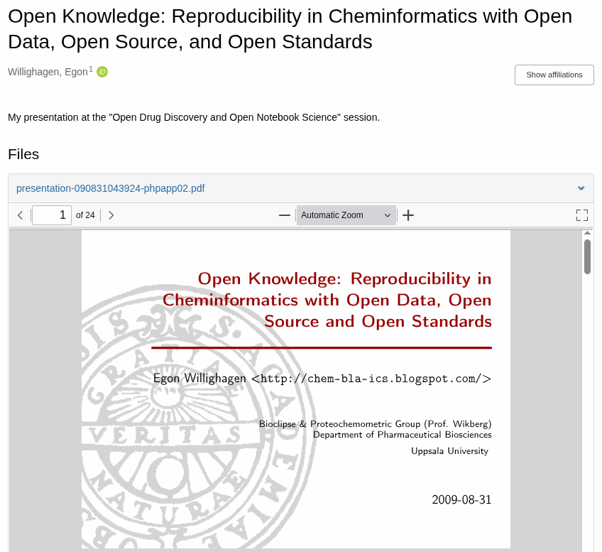 Open Knowledge: Reproducibility in Cheminformatics with ODOSOS https://doi.org/10.59350/t5hgg-stt44 Sep 2, 2009 ~ Feb 28, 2026 Download as: Below are the slides of my presentation of last Monday (see my earlier blogs): cheminf 10.5281/ZENODO.2652076