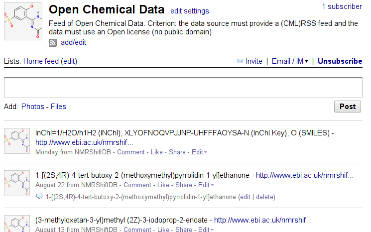Moreover, I have set up a FriendFeed room, Open Chemical Data, where I will aggregate feeds of new molecules in these databases: