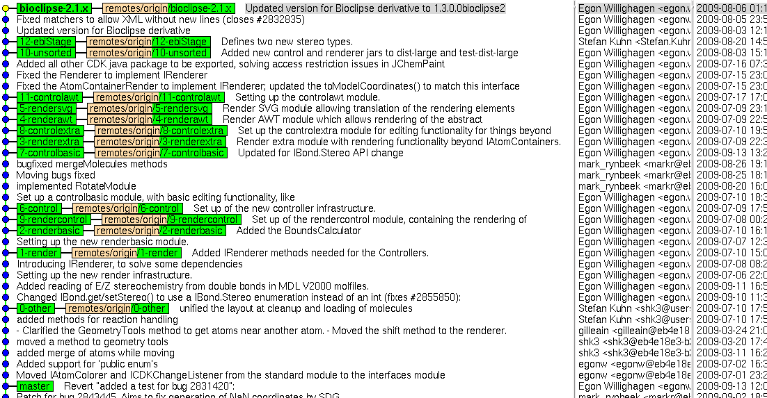 The two top most branches (bioclipse-2.1.x and 12-ebiStage) are actually staging branches: patches that have not yet been integrated into the JChemPaint-Primary branch. Likewise, the 0-other branch is a staging branch for patches that are in or up for the review process for CDK master itself.