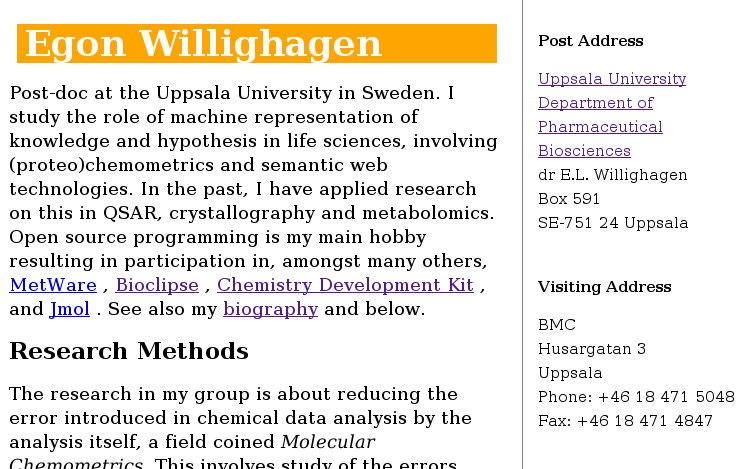 Finally got around to adding a few more bits to my new science homepage: egonw.github.com. Cool thing about this new page is that it is HTML+RDFa, so, my new FOAF profile is embedded in the HTML: