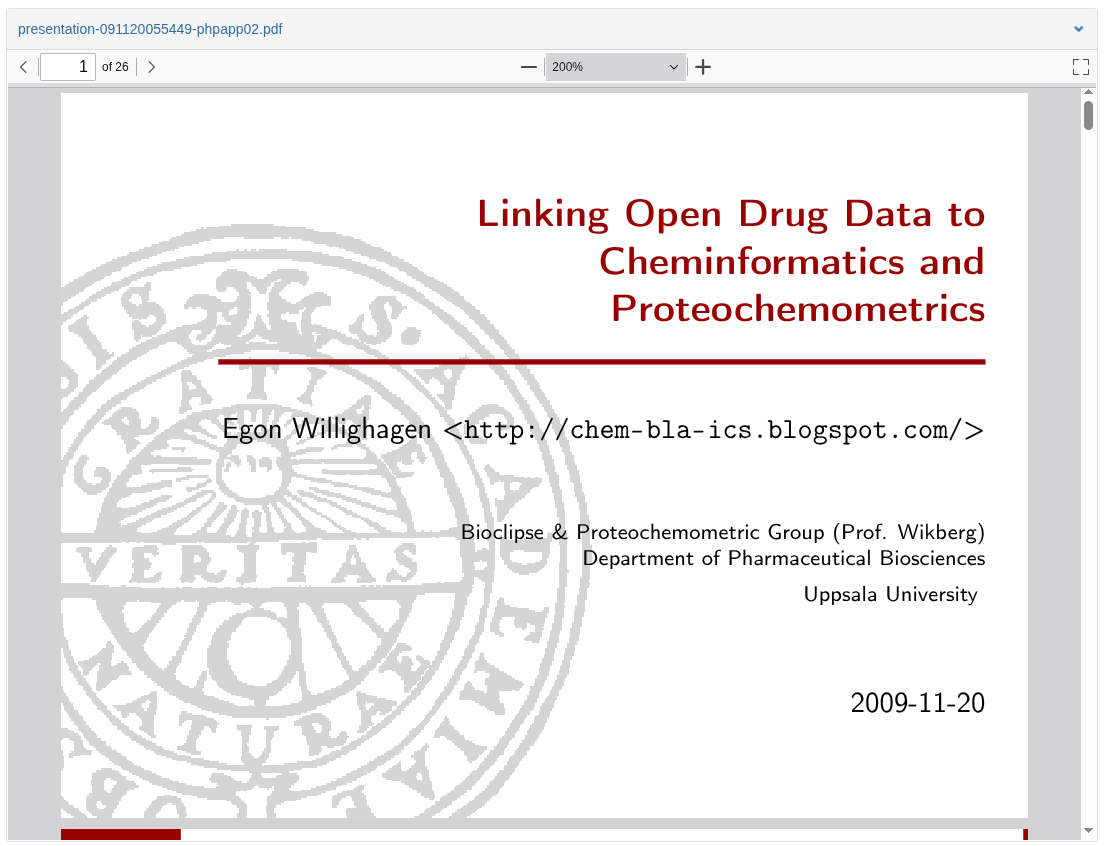 SWAT4LS: "Linking Open Drug Data to Cheminformatics and Proteochemometrics" https://doi.org/10.59350/43dc5-arn55 Nov 21, 2009 ~ Jan 2, 2026 Download as: Please find below the presentation I gave today at SWAT4LS : swat4ls rdf semweb