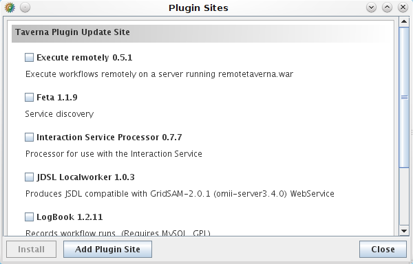 After it is done downloading the plugin, you can close the Plugin Sites and Plugin Manager dialogs. I shutdown and restarted Taverna with