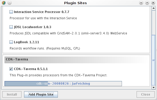 After filling out these values and approving it with the OK button, it will show up on the dialog showing all available plugins, where you need the check the check box in front of the CDK-Taverna plugin name, as done in this screenshot: