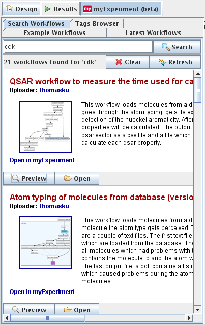 Using the same Taverna Plugin Manager you can also install the MyExperiment plugin that allows you to search, browse, preview and download Taverna workflows from the MyExperiment website from within Taverna itself. I installed the plugin, and then used it to search for CDK workflows (and downloaded a QSAR workflow):
